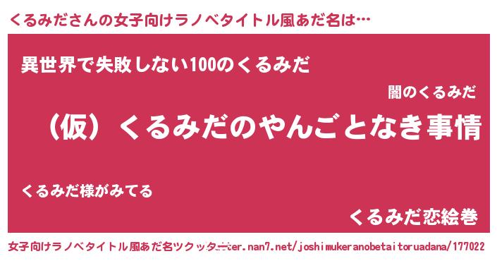 くるみださんの女子向けラノベタイトル風あだ名は… 『(仮)くるみだのやんごとなき事情』『異世界で失敗しない100のくるみだ』『くるみだ恋絵巻』 ツクッター #女子向けラノベタイトル風あだ名ツクッター http://tkutter.nan7.net/joshimukeranobetaitoruadana/177022/