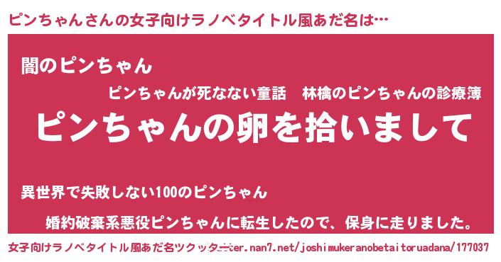 | 男性向けラノベタイトル風あだ名 | 『ダンジョンにピンちゃんを求めるのは間違っているだろうか』 |