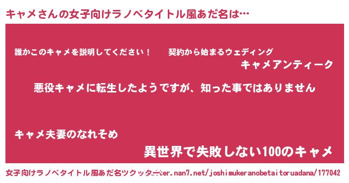 | 男性向けラノベタイトル風あだ名 | 『この素晴らしい世界にキャメを!』 |