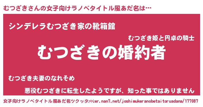 むつざきさんの女子向けラノベタイトル風あだ名は… 『むつざきの婚約者』『シンデレラむつざき家の靴箱館』『悪役むつざきに転生したようですが、知った事ではありません』 ツクッター #女子向けラノベタイトル風あだ名ツクッター http://tkutter.nan7.net/joshimukeranobetaitoruadana/177087/
