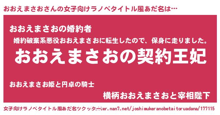 | 男性向けラノベタイトル風あだ名 | 『おおえまさおという概念が存在しない退屈な世界 』 |