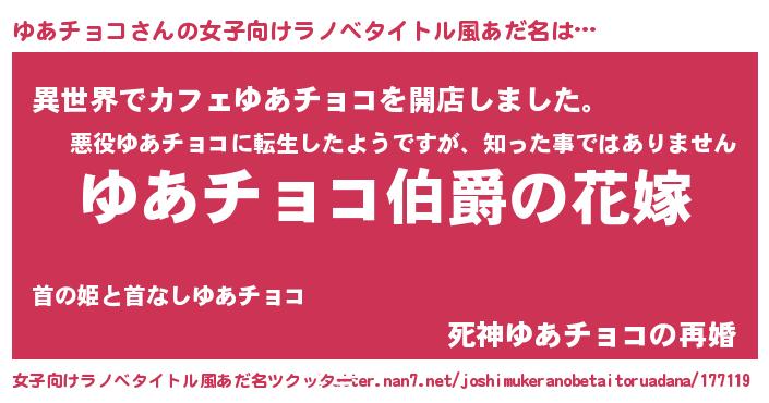 | 男性向けラノベタイトル風あだ名 | 『やはりゆあチョコの青春ラブコメはまちがっている 』 |