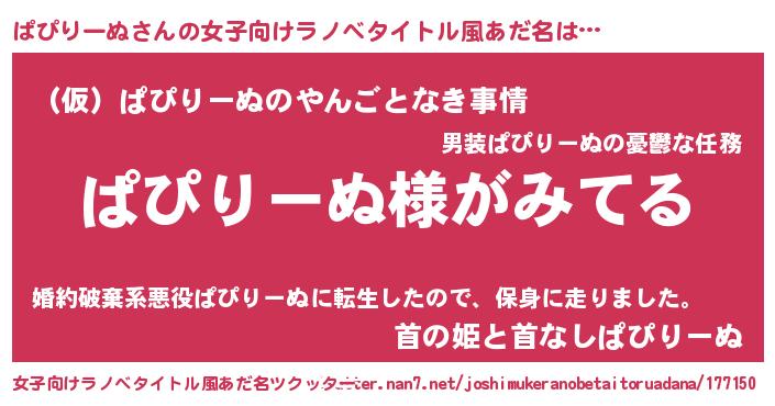 | 男性向けラノベタイトル風あだ名 | 『ぱぴりーぬの嫁は女の子じゃないと思った?』 |
