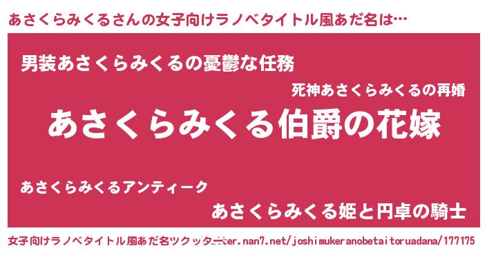 | 男性向けラノベタイトル風あだ名 | 『やはりあさくらみくるの青春ラブコメはまちがっている 』 |