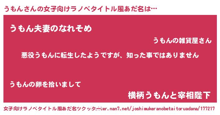 | 男性向けラノベタイトル風あだ名 | 『この素晴らしい世界にうもんを!』 |