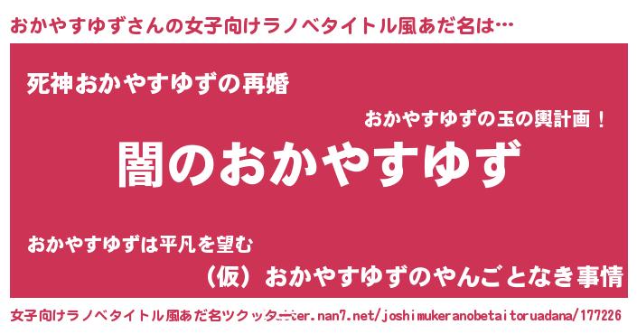 | 男性向けラノベタイトル風あだ名 | 『Re:おかやすゆずから始める異世界生活』 |