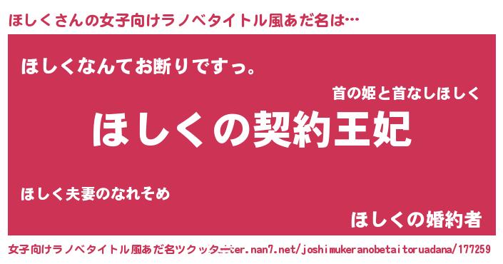 ほしくさんの女子向けラノベタイトル風あだ名は… 『ほしくの契約王妃』『ほしくなんてお断りですっ。』『ほしくの婚約者』 ツクッター #女子向けラノベタイトル風あだ名ツクッター http://tkutter.nan7.net/joshimukeranobetaitoruadana/177259/