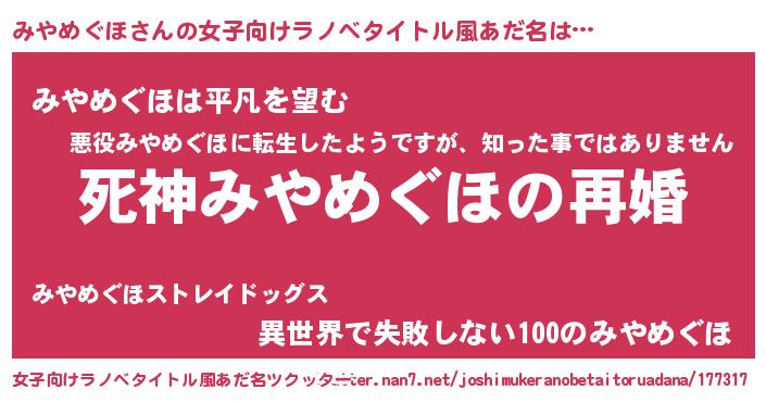 | ヒーロー風カッコイイあだ名 | 『慈愛の使者みやめぐほ』『幻影騎士ミヤ』 |