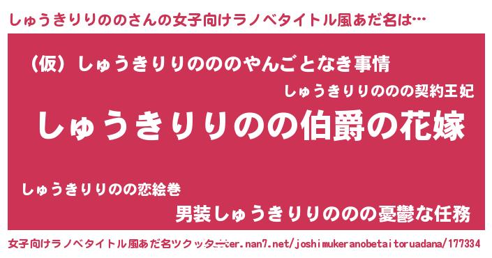 | 男性向けラノベタイトル風あだ名 | 『やはりしゅうきりりののの青春ラブコメはまちがっている 』 |