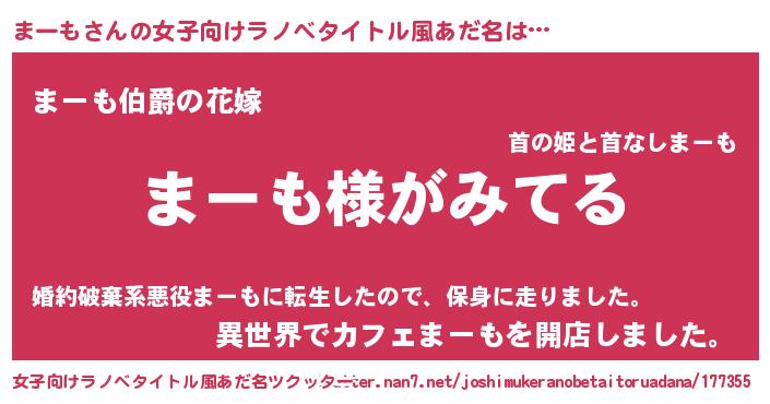 | 男性向けラノベタイトル風あだ名 | 『まーもの嫁は女の子じゃないと思った?』 |