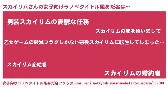 | 男性向けラノベタイトル風あだ名 | 『魔弾の王とスカイリム』 |