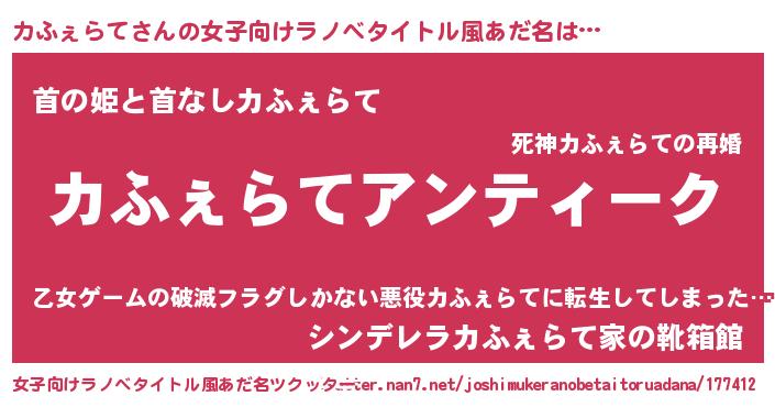| 意味不明あだ名 | 『自称カふぇらて』『ペロリンカふぇらて』 |