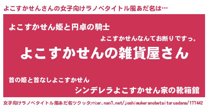 よこすかせんさんの女子向けラノベタイトル風あだ名は… 『よこすかせんの雑貨屋さん』『よこすかせん姫と円卓の騎士』『シンデレラよこすかせん家の靴箱館』 ツクッター #女子向けラノベタイトル風あだ名ツクッター http://tkutter.nan7.net/joshimukeranobetaitoruadana/177442/