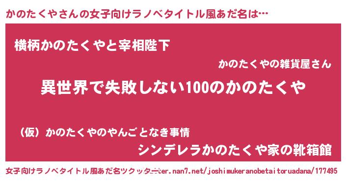 | 男性向けラノベタイトル風あだ名 | 『かのたくやという概念が存在しない退屈な世界 』 |