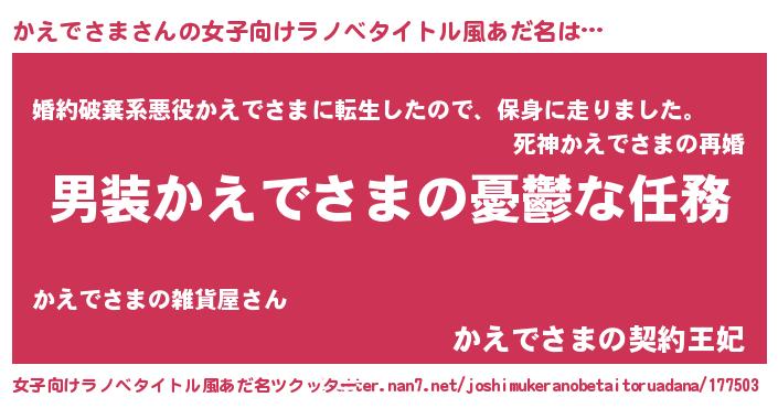 | 男性向けラノベタイトル風あだ名 | 『うちのかえでさまが世界を掌握している!』 |