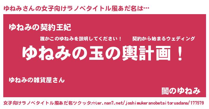 | 男性向けラノベタイトル風あだ名 | 『ゆねみ~年齢イコール彼女いない歴の魔法使い~』 |