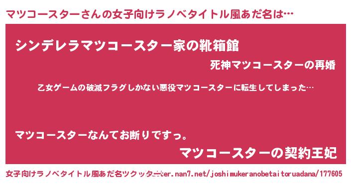 | 男性向けラノベタイトル風あだ名 | 『この素晴らしい世界にマツコースターを!』 |