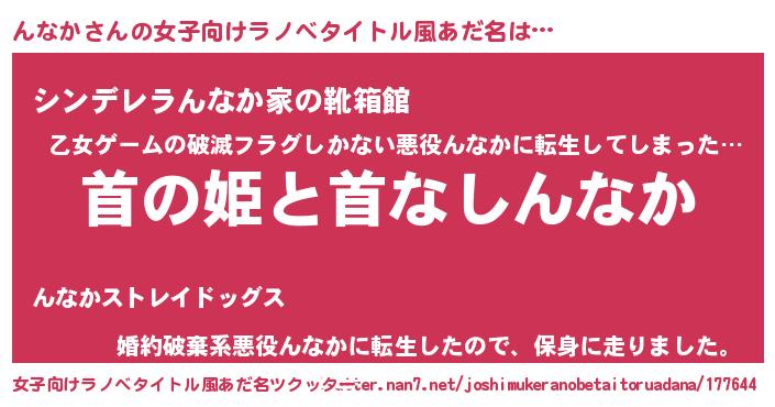 | 男性向けラノベタイトル風あだ名 | 『はたらくんなかさま!』『緋弾のンナカ』 |
