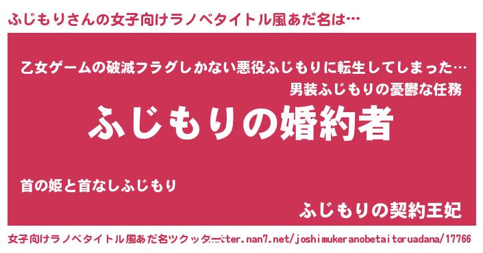 | 男性向けラノベタイトル風あだ名 | 『うちの娘の為ならば、俺はもしかしたらふじもりも倒せるかもしれない。』 |