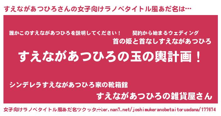 | 男性向けラノベタイトル風あだ名 | 『すえながあつひろ~年齢イコール彼女いない歴の魔法使い~』 |