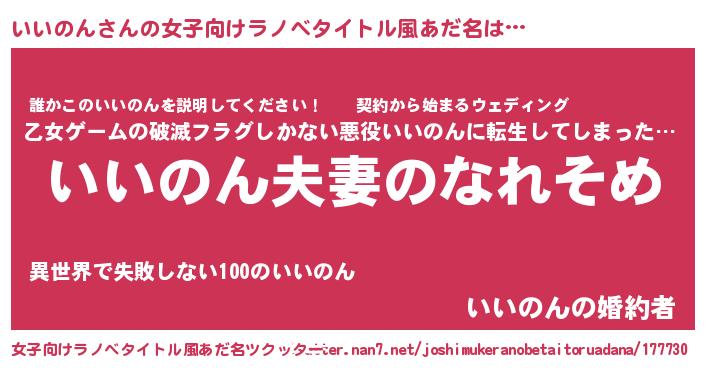 | 男性向けラノベタイトル風あだ名 | 『おまえをオタクにしてやるから、俺をいいのんにしてくれ! 』 |