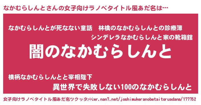 | 男性向けラノベタイトル風あだ名 | 『Re:なかむらしんとから始める異世界生活』 |