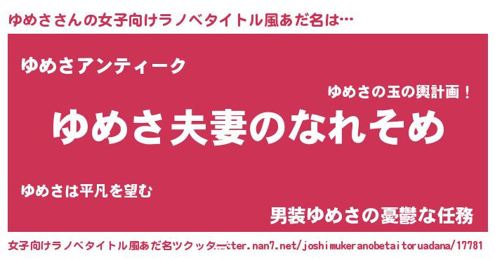 | 男性向けラノベタイトル風あだ名 | 『おまえをオタクにしてやるから、俺をゆめさにしてくれ! 』 |