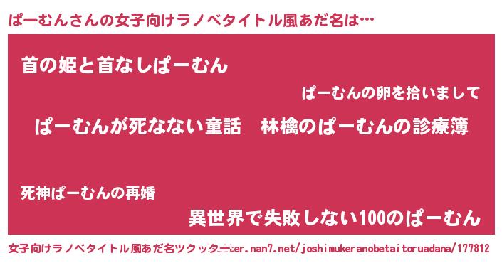 | 男性向けラノベタイトル風あだ名 | 『魔弾の王とぱーむん』 |