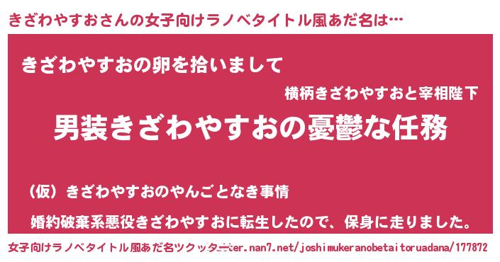 | 男性向けラノベタイトル風あだ名 | 『うちのきざわやすおが世界を掌握している!』 |