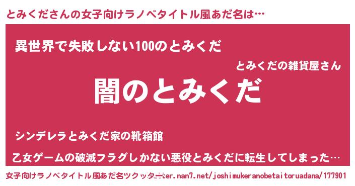 | 男性向けラノベタイトル風あだ名 | 『Re:とみくだから始める異世界生活』 |