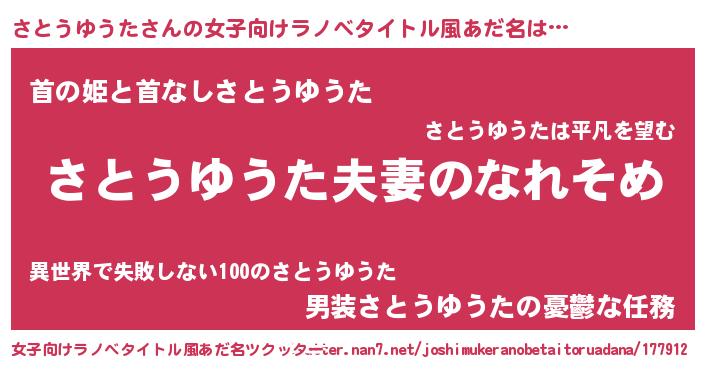 | 男性向けラノベタイトル風あだ名 | 『おまえをオタクにしてやるから、俺をさとうゆうたにしてくれ! 』 |