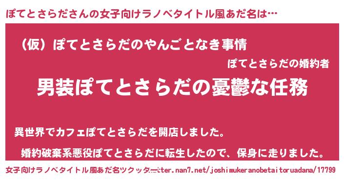 | 男性向けラノベタイトル風あだ名 | 『うちのぽてとさらだが世界を掌握している!』 |