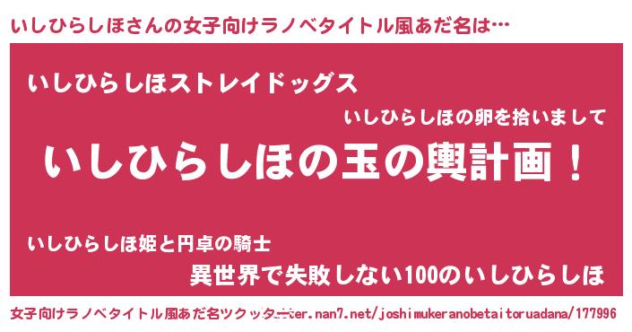 | 男性向けラノベタイトル風あだ名 | 『転生したらいしひらしほだった件』 |