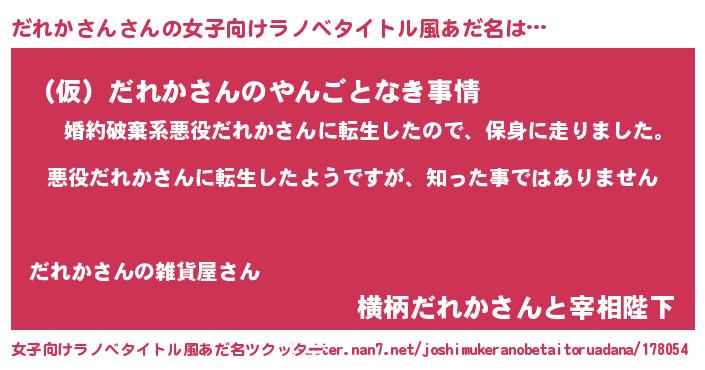 | 男性向けラノベタイトル風あだ名 | 『この素晴らしい世界にだれかさんを!』 |