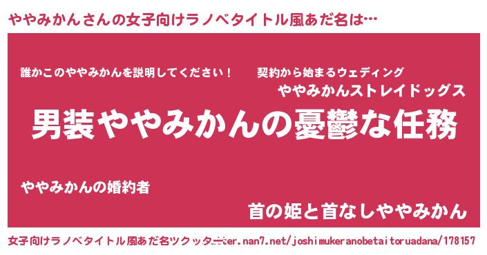 | 男性向けラノベタイトル風あだ名 | 『うちのややみかんが世界を掌握している!』 |
