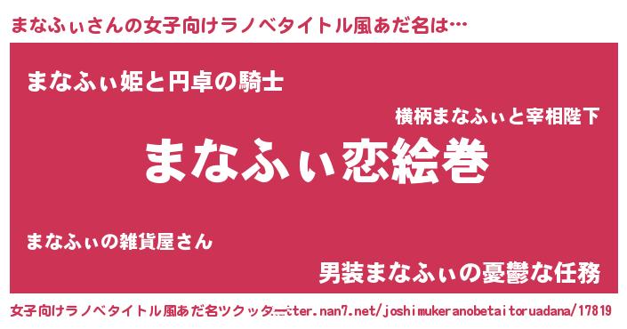 | 男性向けラノベタイトル風あだ名 | 『おまえをオタクにしてやるから、俺をまなふぃにしてくれ! 』 |