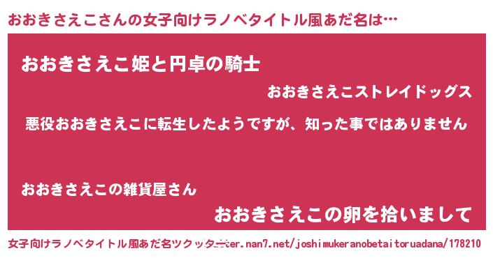 | 男性向けラノベタイトル風あだ名 | 『この素晴らしい世界におおきさえこを!』 |
