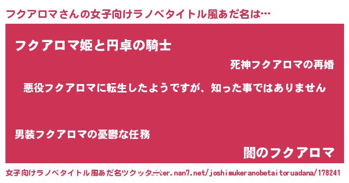 | 男性向けラノベタイトル風あだ名 | 『この素晴らしい世界にフクアロマを!』 |