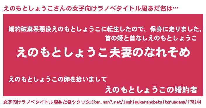 | 男性向けラノベタイトル風あだ名 | 『おまえをオタクにしてやるから、俺をえのもとしょうこにしてくれ! 』 |