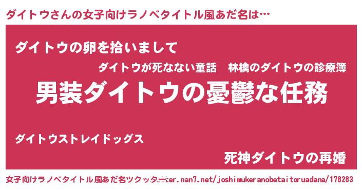 ダイトウさんの女子向けラノベタイトル風あだ名は… 『男装ダイトウの憂鬱な任務』『ダイトウの卵を拾いまして』『死神ダイトウの再婚』 ツクッター #女子向けラノベタイトル風あだ名ツクッター http://tkutter.nan7.net/joshimukeranobetaitoruadana/178283/