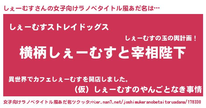 | 男性向けラノベタイトル風あだ名 | 『しぇーむすに滅ぼされるだけの簡単なお仕事です』 |