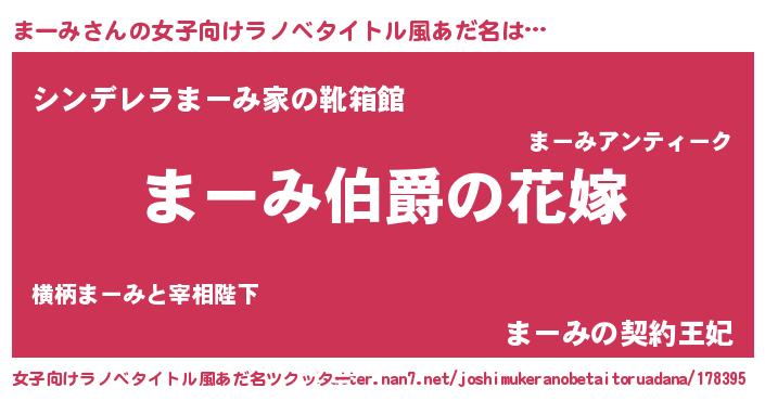 | 男性向けラノベタイトル風あだ名 | 『うちの娘の為ならば、俺はもしかしたらまーみも倒せるかもしれない。』 |