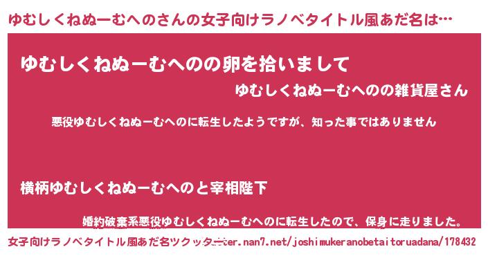 | 男性向けラノベタイトル風あだ名 | 『この素晴らしい世界にゆむしくねぬーむへのを!』 |