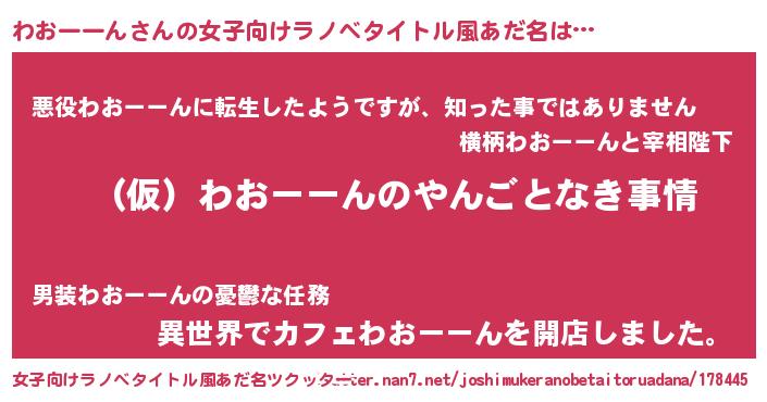 | 男性向けラノベタイトル風あだ名 | 『わおーーんの憂鬱』 |