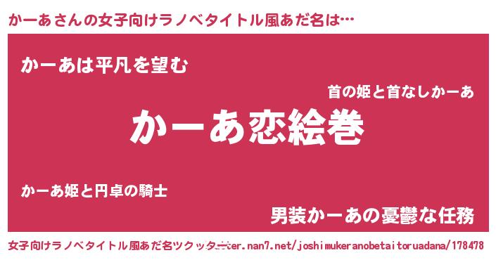 | 男性向けラノベタイトル風あだ名 | 『おまえをオタクにしてやるから、俺をかーあにしてくれ! 』 |