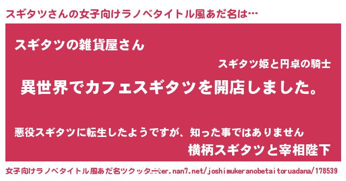 | 男性向けラノベタイトル風あだ名 | 『誰もが恐れるあのスギタツが、ぼくの専属メイドになるようです。』 |