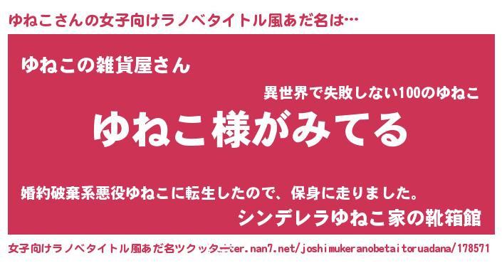 | 男性向けラノベタイトル風あだ名 | 『ゆねこの嫁は女の子じゃないと思った?』 |