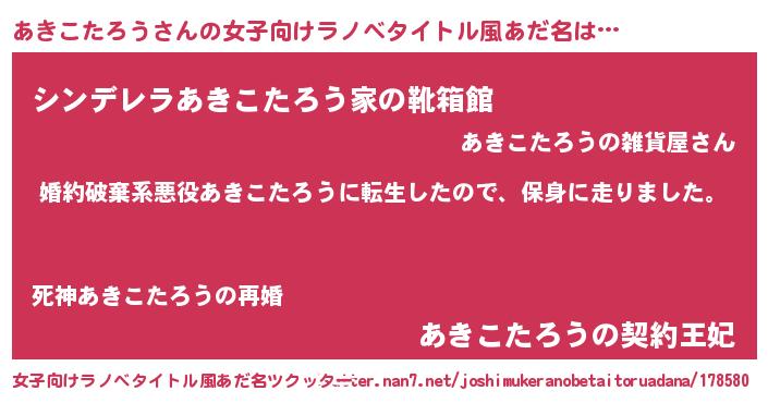 | 男性向けラノベタイトル風あだ名 | 『転生したらあきこたろうだった件』 |