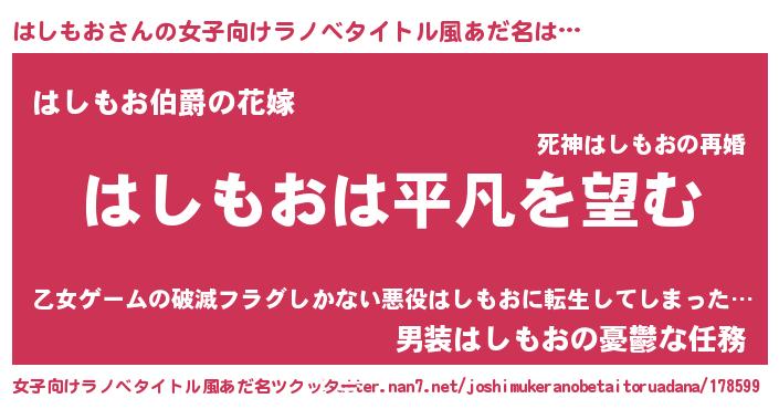 | 男性向けラノベタイトル風あだ名 | 『ダンジョンにはしもおを求めるのは間違っているだろうか』 |