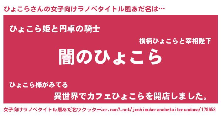 | 男性向けラノベタイトル風あだ名 | 『Re:ひょこらから始める異世界生活』 |